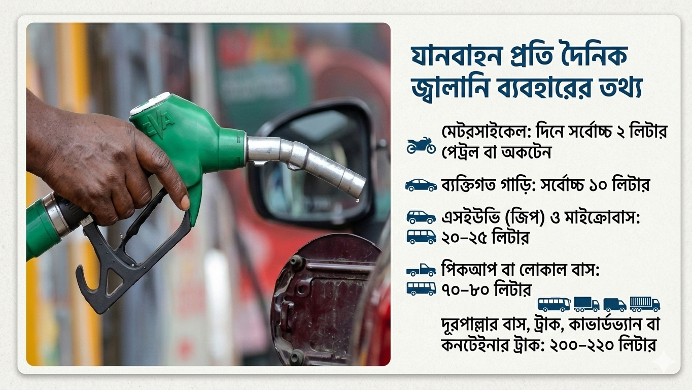 নতুন সিদ্ধান্ত অনুযায়ী বিভিন্ন ধরনের যানবাহনের জন্য প্রতিদিন নির্দিষ্ট পরিমাণ জ্বালানি তেল নির্ধারণ করা হয়েছে।